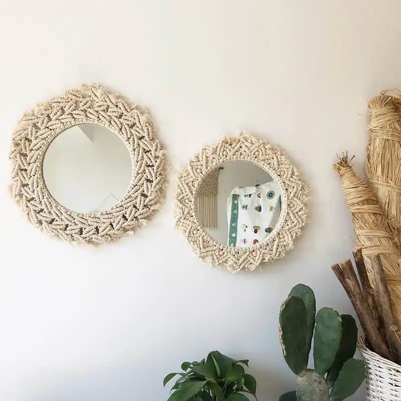 Round Lace Wall Hanging Mirror Art Deco Hand Made Cotton Rope