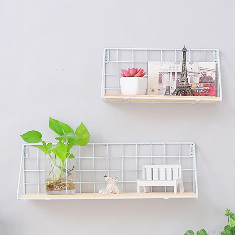 Wood Wall Shelf Wrought Iron Grid Storage Shelf White Small With