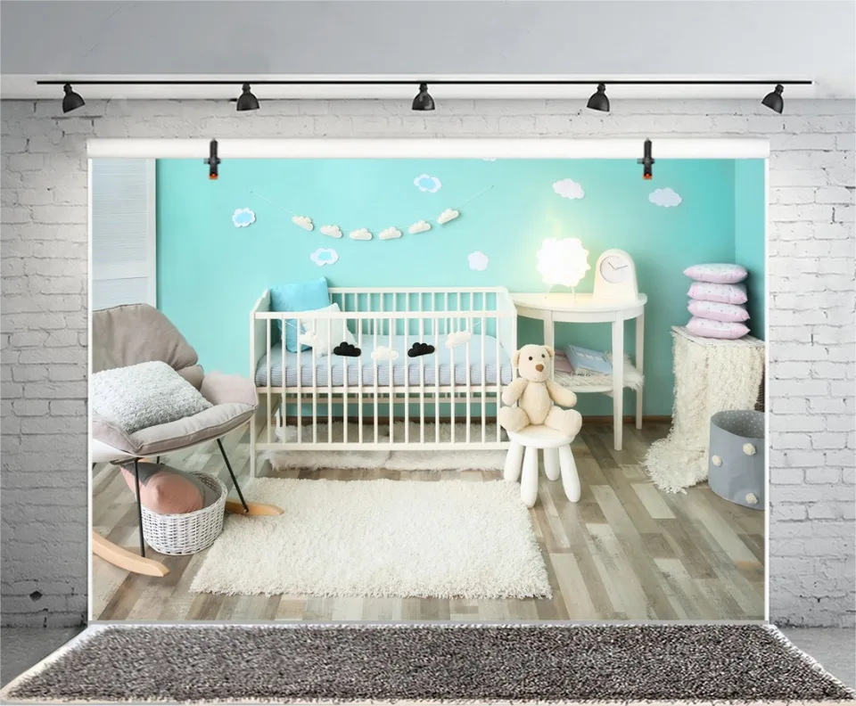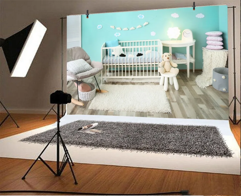 Laeacco Baby Room Crib Blue Wall Crib Lamp Carpet Bear Photography