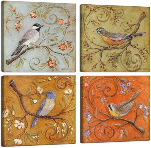 Amazon Com Natural Art Bird And Flower Painting 4 Pcs Wall Art