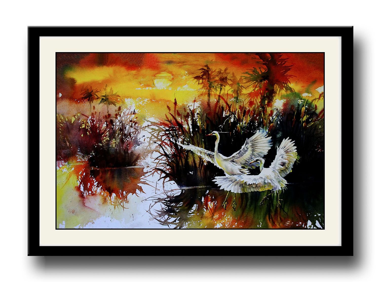 Original Watercolor Bird Painting Flying Birds Silhouette Tree