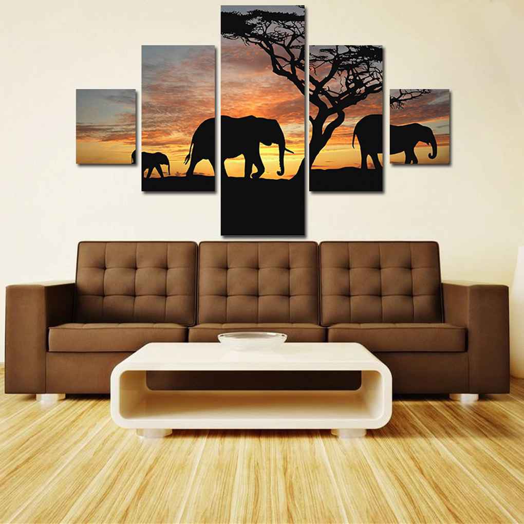 5 Panel Modern Printed 3 Elephants Sunset Tree Oil Painting Wall