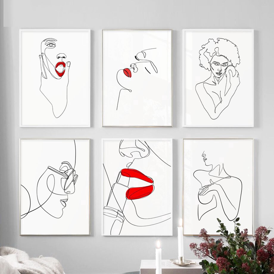 Line Drawn Red Lips Sexy Girl Wall Art Canvas Painting Abstract