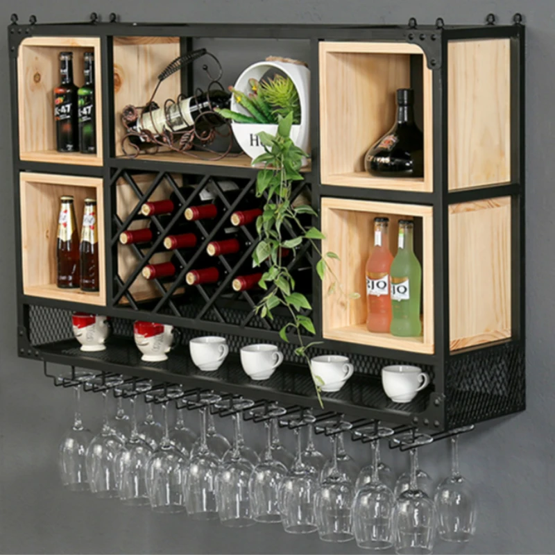 Wine Rack Wall Hanging Wine Cabinet Wall Shelf Wrought Iron Wood