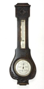 Antique English Carved Oak Banjo Wall Barometer Thermometer