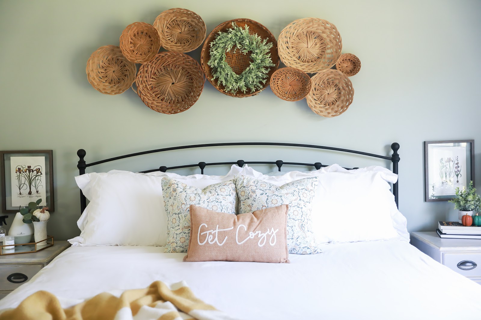 Woven Baskets On Wall Over White Metal Bed Cottage Bedroom